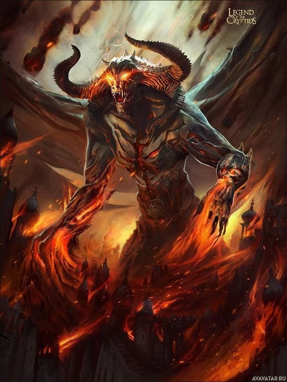 a fantasy scene featuring a demonic figure with red, fiery eyes. This creature appears to be in an intense, aggressive pose, possibly in