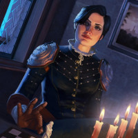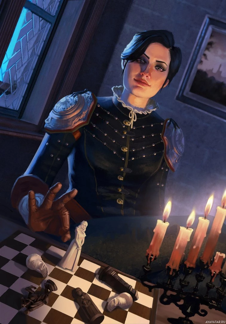 a dark outfit with some armor elements, sitting at a table. On the table, there are chess pieces and a board indicating that she might be playing