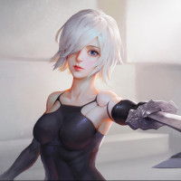 Это иллюстрация женского персонажа по имени YoRHa No.2 Type B, который появляется из видеоигры «Nier: Automata». Персонаж изображен со светлыми волосами и носит черный и серебряный наряд с мечом, привязанным к ее спине. Художественный стиль предполагает, что это цифровая иллюстрация, которая захватывает персонажа в динамической позе.