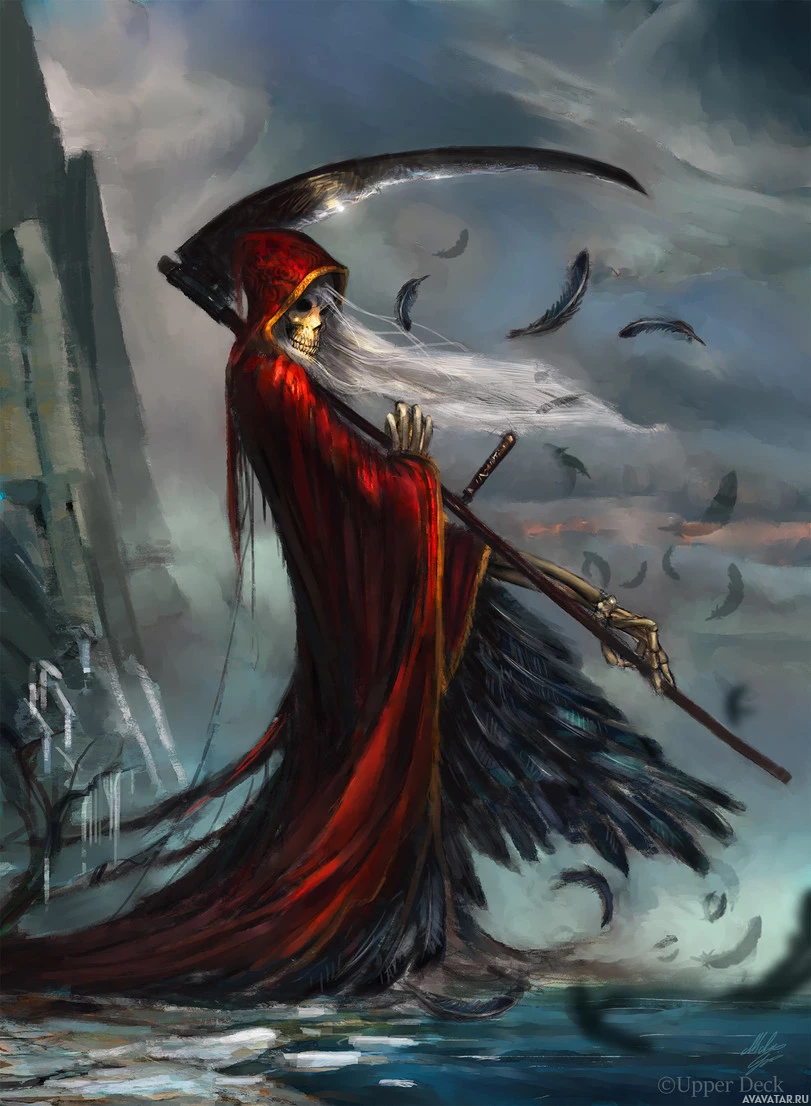 a symbol of mortality and the end of life in many cultures. The setting is dramatic, with a dark,