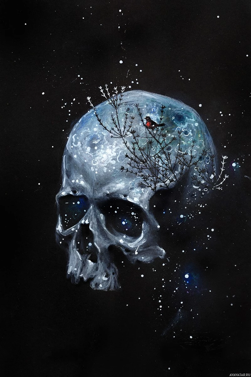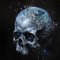 a night sky filled with cosmic phenomena. There is also what appears to be a plant sprouting from the top of the skull's cranium, adding