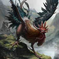 a fantastical creature that appears to be a combination of a rooster and a griffin. It has the body of a rooster, with feathers and a red crest on its head, and wings resembling those of a griffin or eagle, complete with