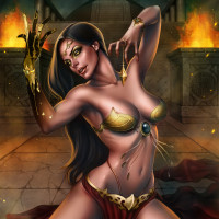 armor pieces and ornaments. Behind her, there are flames suggesting a fire or