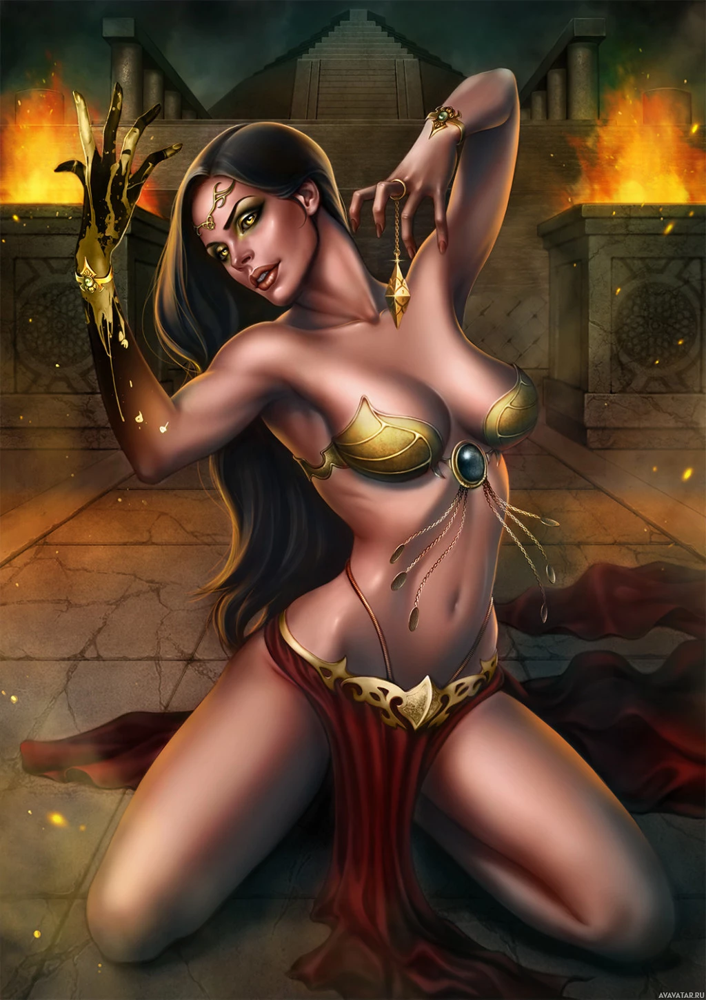 female character. She appears to be in a seductive or alluring pose, wearing a revealing costume that includes