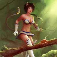 an animated character who appears to be a girl with cat-like features, such as ears and possibly whiskers. She is dressed in a bikini and boots, suggesting a playful or fantasy theme. In her hands, she holds what looks like a tennis racket and a fishing net, hinting at