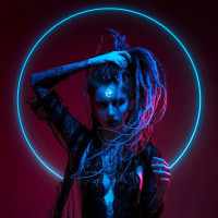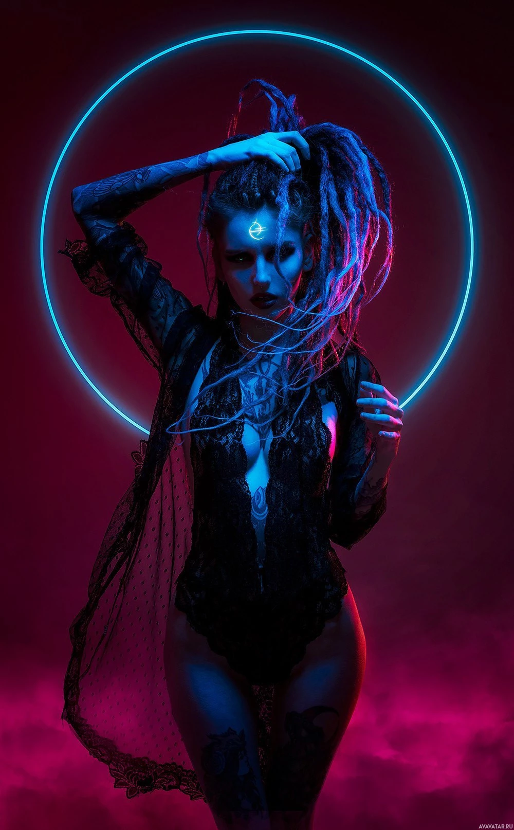 The image shows a person posing in front of a backdrop with a neon blue circle and a pink