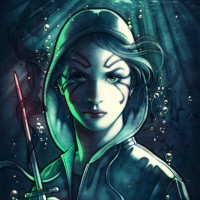 an illustrated character of a girl with a hooded cloak, holding a knife and surrounded by bubbles that suggest she is underwater. She has a stylized appearance, possibly indicative of being drawn in the style of