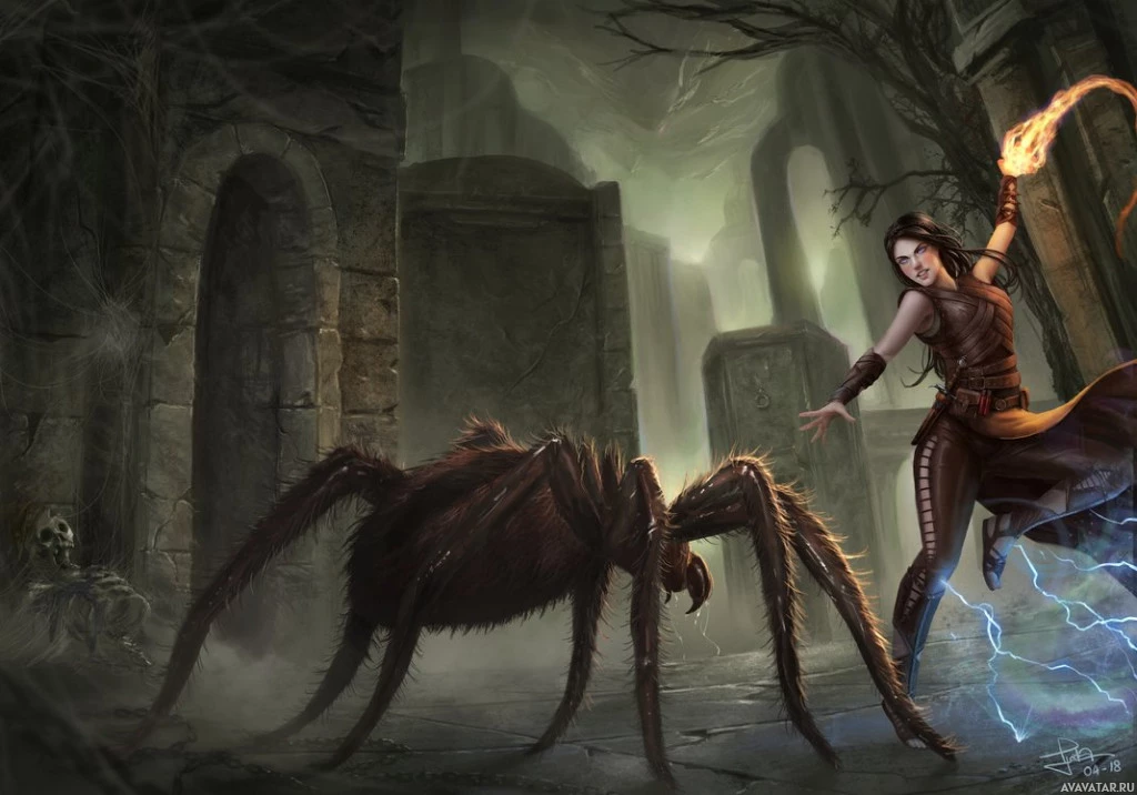 an arcane energy emanating from it that seems to be interacting with two large spiders on either side of her. The setting has an ancient or mystical ambiance with stone pillars and