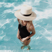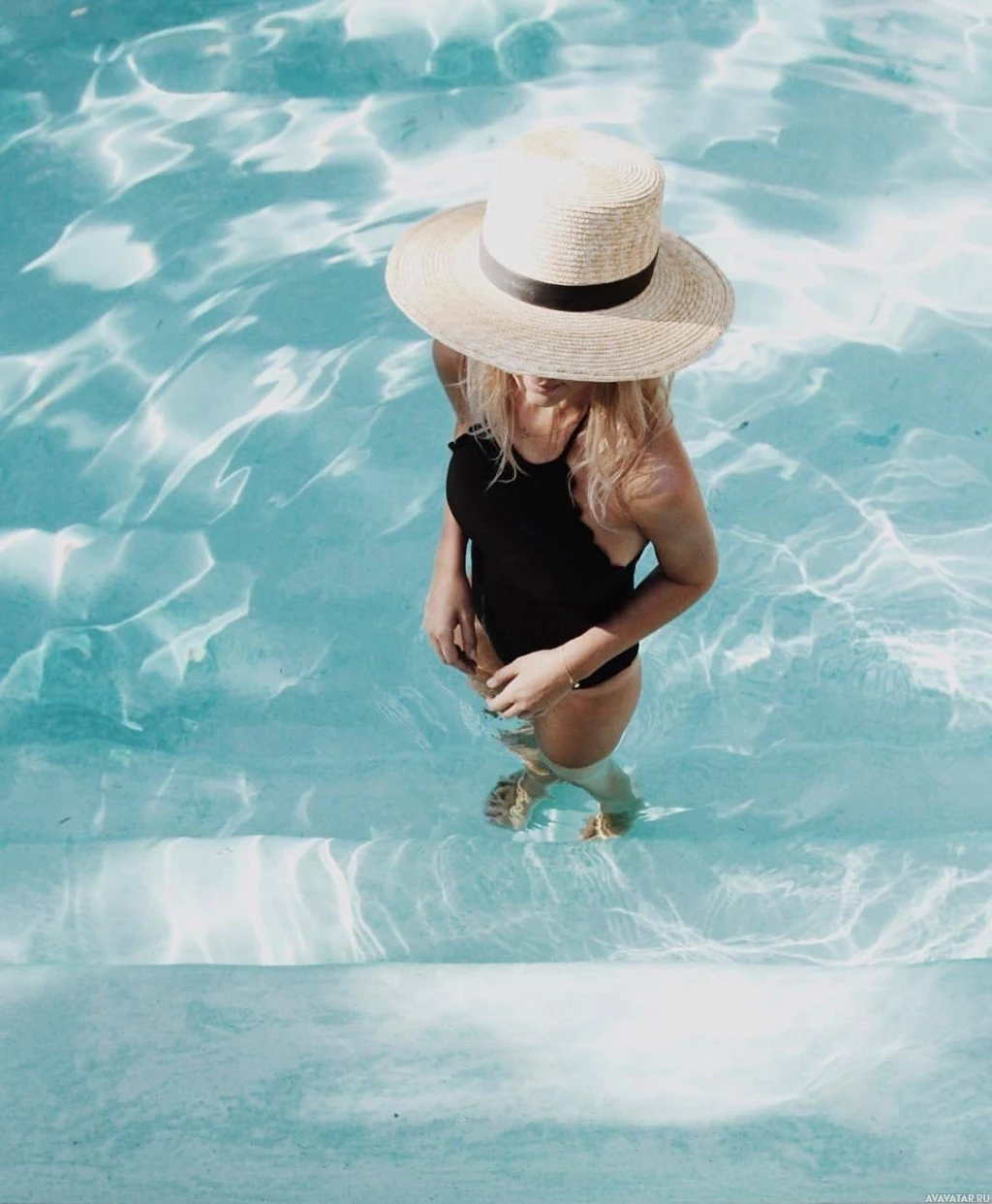 straw hat, which suggests she might be spending time at a beach or a sunny location where protection from the sun is needed. Her pose indicates that she's either wading in