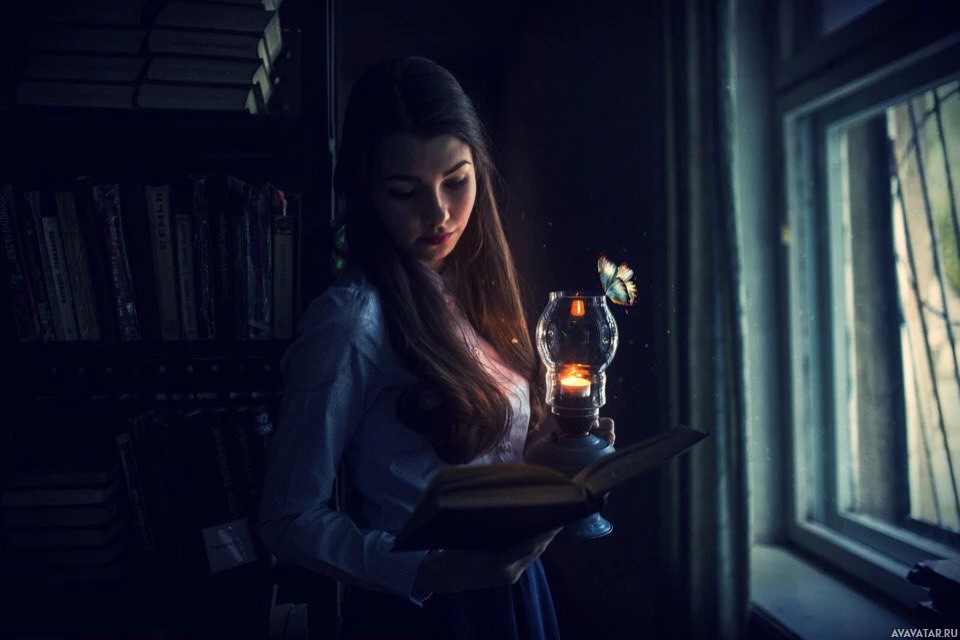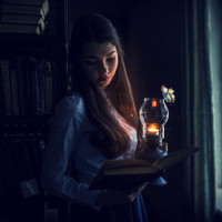 an open book and a small glowing lantern. Her gaze is directed downwards towards the book, suggesting that she may be reading or preparing to read. The ambiance of the room and the use of the lantern give the scene a quiet, contemplative feel, possibly indicating a late-night reading session in