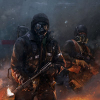military gear, including gas masks, which suggests they might be responding to a hazardous environment or facing potential chemical or biological threats. One soldier is prominently positioned in the foreground, while others are slightly behind and to his sides, forming