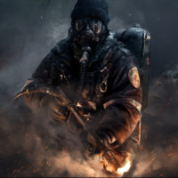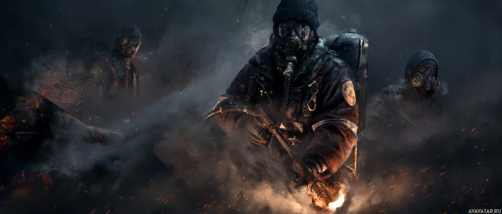 a group of soldiers in what appears to be an urban or industrial setting. One soldier is seated, possibly taking cover behind a shield, while the others stand with their weapons at the ready. There are visible signs of combat, such as smoke and debris, suggesting that they are engaged in