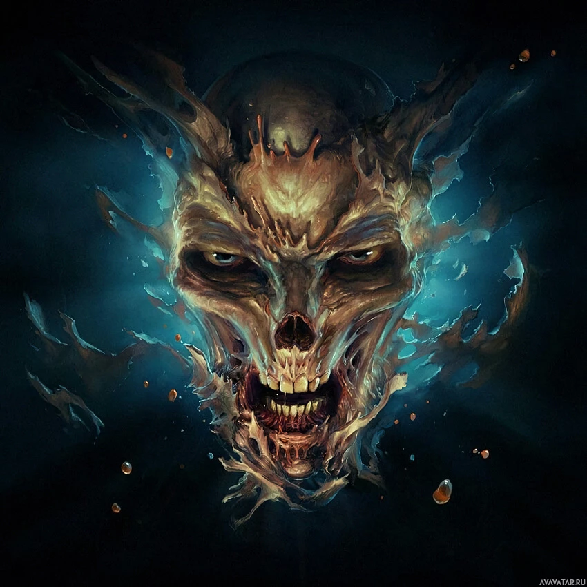 a skeletal figure with a fierce, menacing expression. It has a dark blue background that gives the impression of a shadowy or