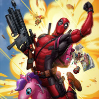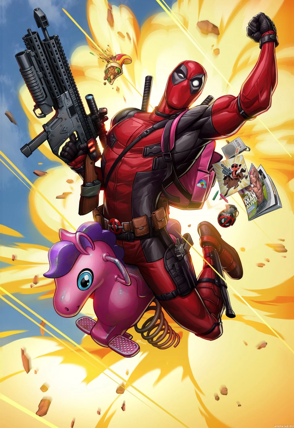 energy scene typical of superhero comics or movies. Deadpool is riding a unicorn, which adds