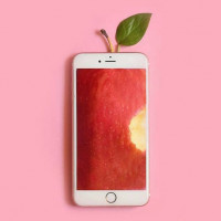 The image shows a smartphone displaying a picture of an apple with the backdrop of a leaf. The phone appears to be resting on a pink surface, and there's a visible logo indicating it is an Apple product. This setup suggests a brand connection with the fruit depicted in the picture displayed on the device.