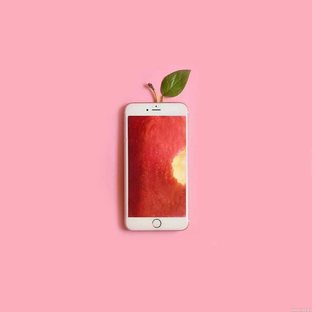 На картинке изображен смартфон, отображающий изображение яблока на фоне листа. Телефон, кажется, покоится на розовой поверхности, и есть видимый логотип, указывающий, что это продукт Apple. Эта настройка предполагает связь бренда с фруктами, изображенными на изображении, отображаемом на устройстве.