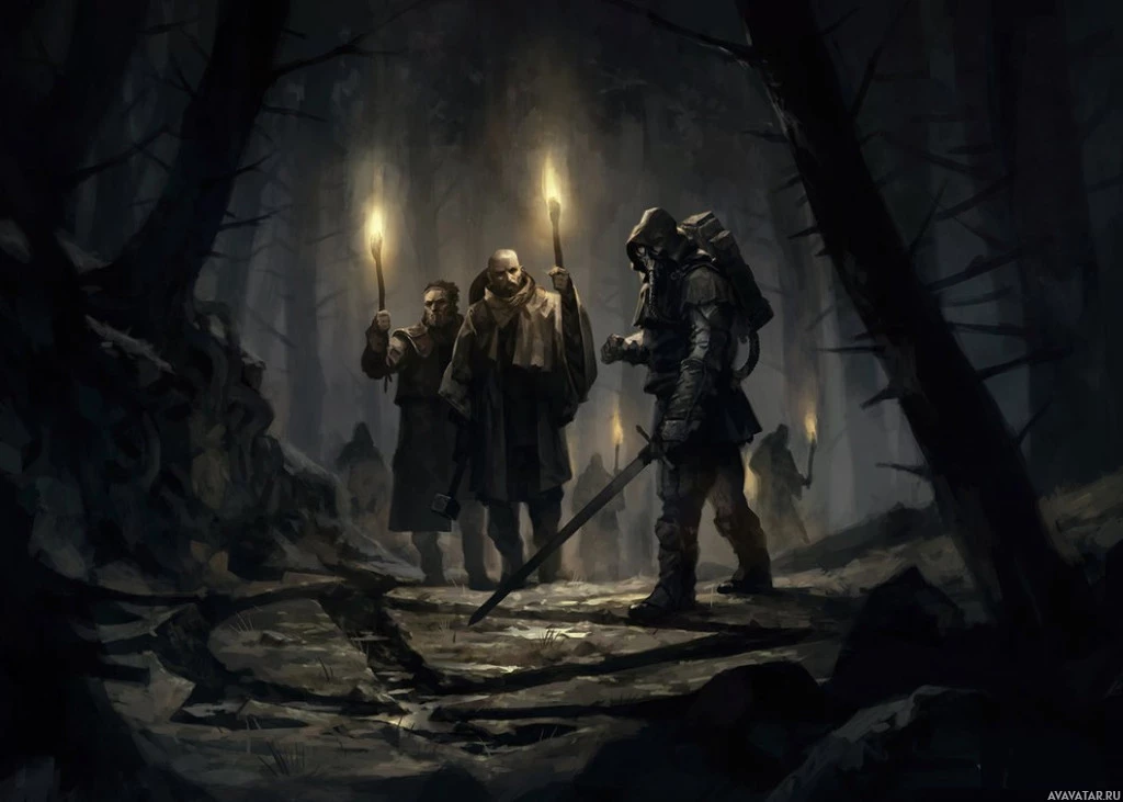 a forest at night. One man is holding a torch while the others hold weapons such as swords and shields. They are dressed in what appears to be historical or fantasy-style armor, suggesting that they could be warriors or adventurers. The atmosphere is dimly lit, with some mist and possibly