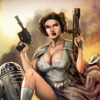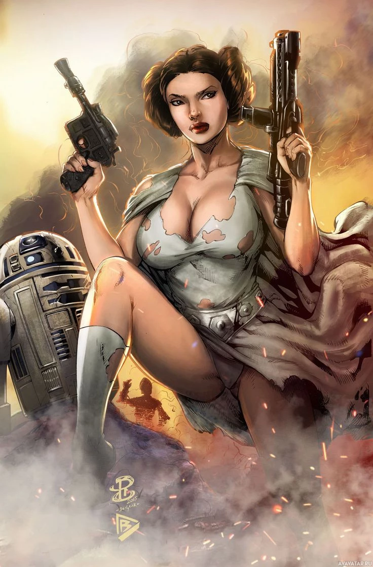 a dynamic pose, holding what appears to be blaster weapons and ready for action. The background suggests