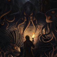 a fantastical scene that appears to be inspired by the Cthulhu mythos, which is a genre of horror fiction. In this artwork, there is a central figure who seems to be a human male with a torch, illuminating