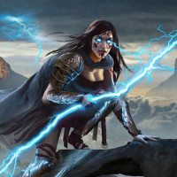 Картинка показывает женский персонаж в фантастической обстановке. У нее длинные волосы и она одета в доспехи, держа в руках посох, излучающий молнию. На заднем плане находятся скальные образования и темное небо с облаками, создающие атмосферу таинственности и приключений.