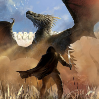 a human figure on the right side who seems to be interacting with one of the dragons, perhaps as a rider or trainer. The setting looks like it could be
