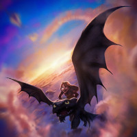 large wings. In the background, there are clouds, suggesting they might be flying high in the sky. The overall mood of the image is adventurous and fantastical.