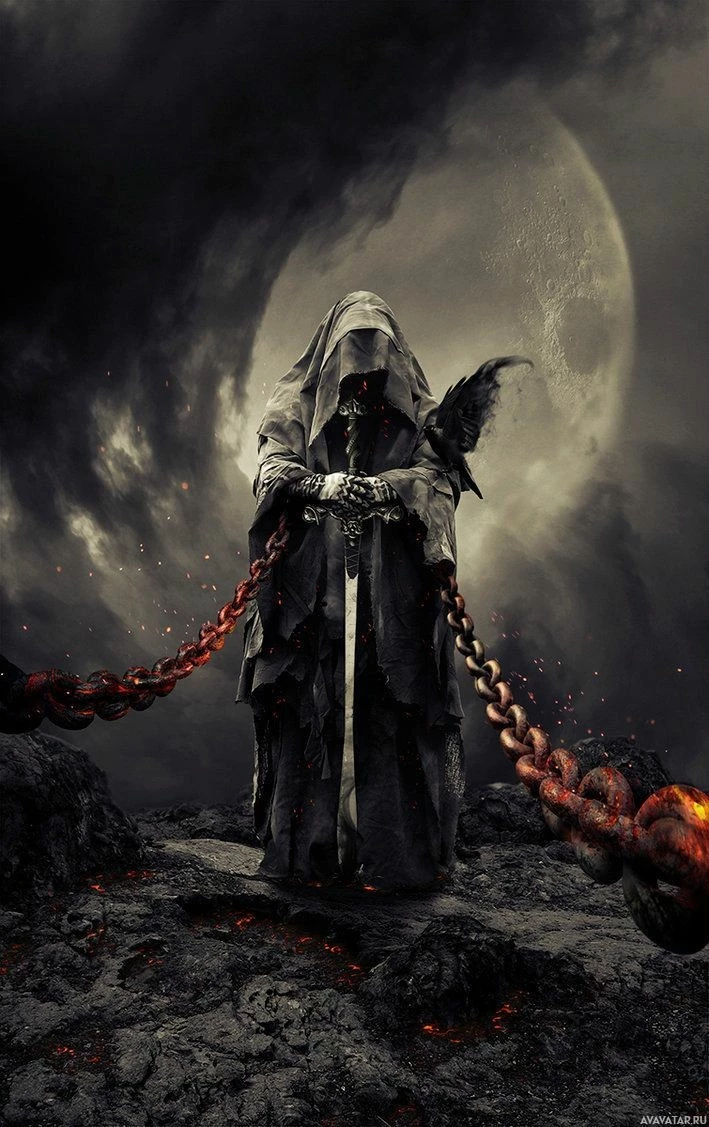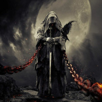 hooded cloak, chains, and the sword it holds in one hand while pointing with the other towards what seems to be a fiery, hellish landscape. The figure's attire and posture suggest a powerful and malevolent presence, possibly representing evil or darkness within a narrative context. The use of red and black hues throughout the image contributes to its