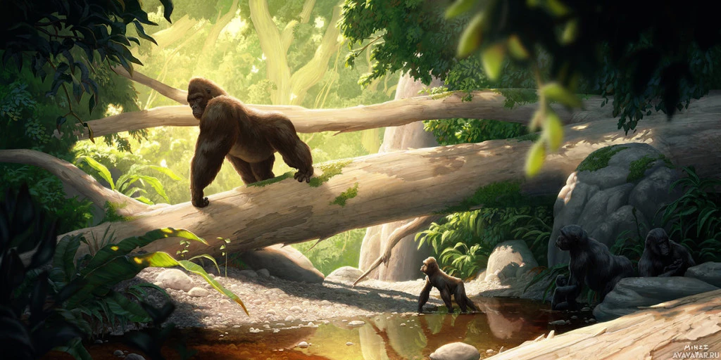 The image features a depiction of a gorilla and a monkey, both in