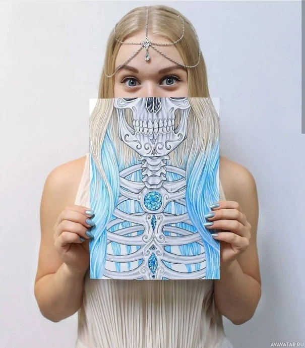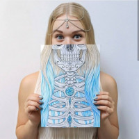 a young woman with blonde hair wearing an adornment on her head that could be interpreted as a tiara or headband. She's holding up a colorful cardboard cutout of a skull with