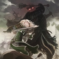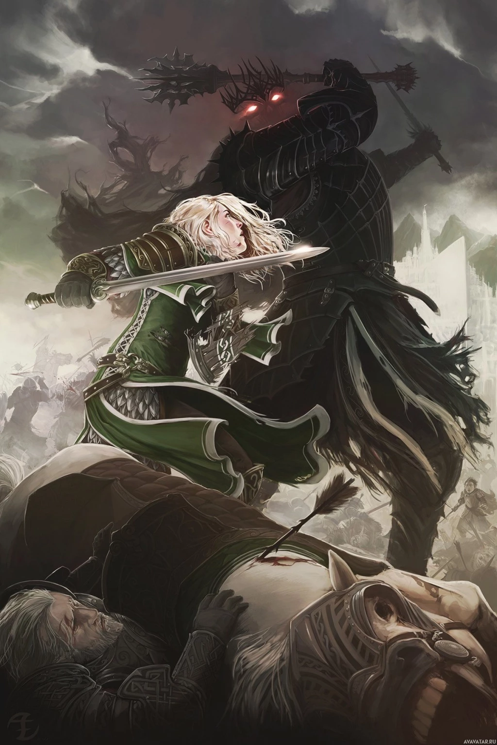 The image depicts a scene from J.R.R. Tolkien's Middle-earth, featuring two characters: a girl and Sauron. The girl is wielding a sword and appears to be in combat with Sauron, who is shown as an imposing figure with