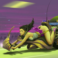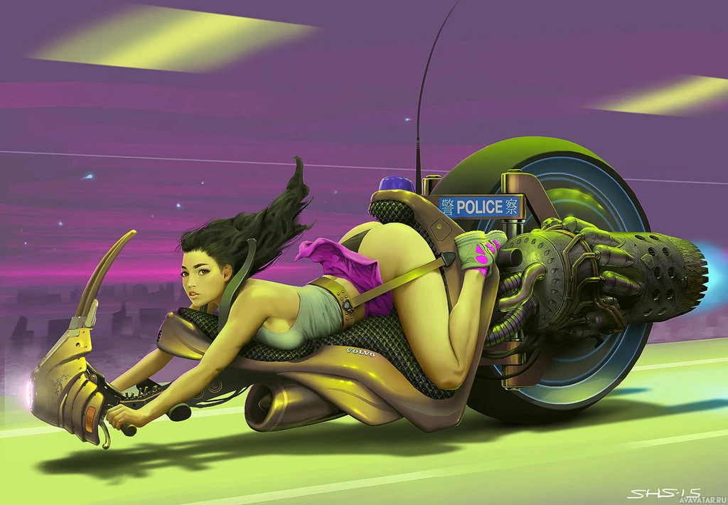 futuristic attire riding a motorcycle. The character appears to be a woman with