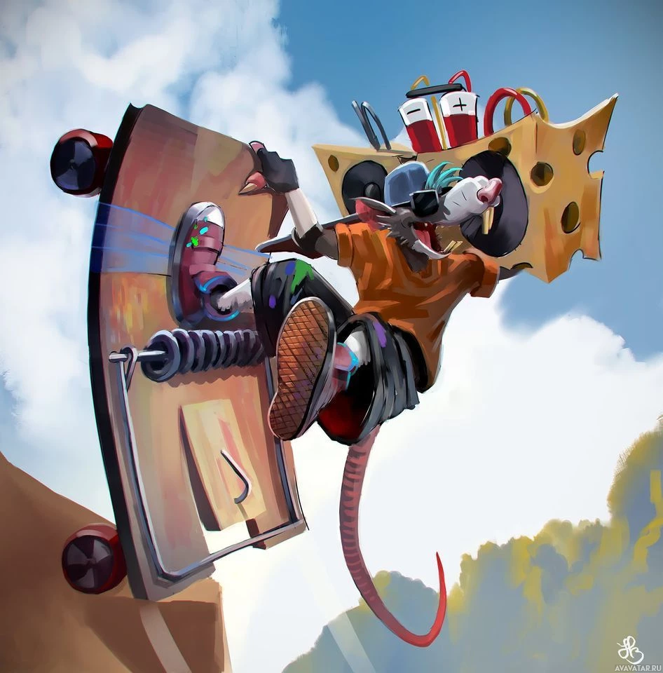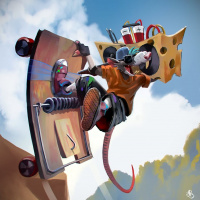 a cartoon mouse riding a skateboard down the side of a ramp. The mouse is wearing human-like clothing and is in mid-air, giving the impression that it is performing a trick on its skateboard. The background suggests