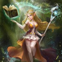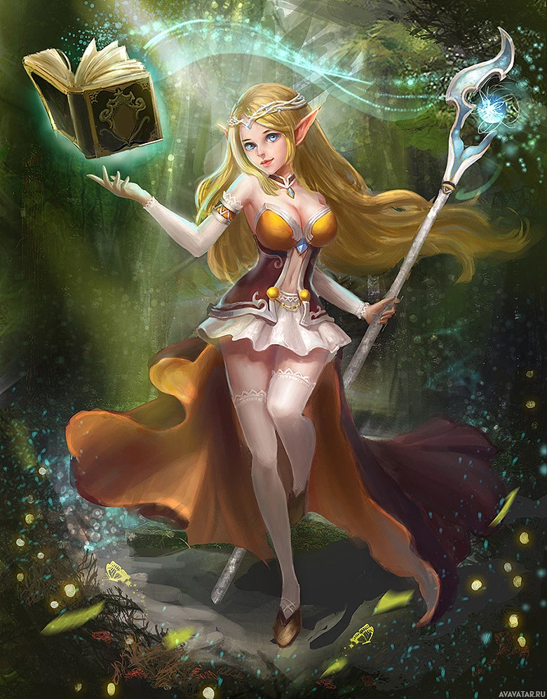 blonde hair, pointed ears, and is wearing a magical staff and holding a book that glows with magical energy. Her outfit includes a dress with golden elements and she's standing on what looks like a floating platform surrounded by