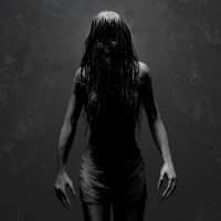 disheveled hair and stands with its arms outstretched in front of it. It is depicted against a stark background, possibly within