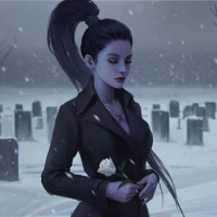 game series. She is standing in front of a graveyard, looking down at what appears to be a rose she's holding in her hand. Her eyes are closed, and she has