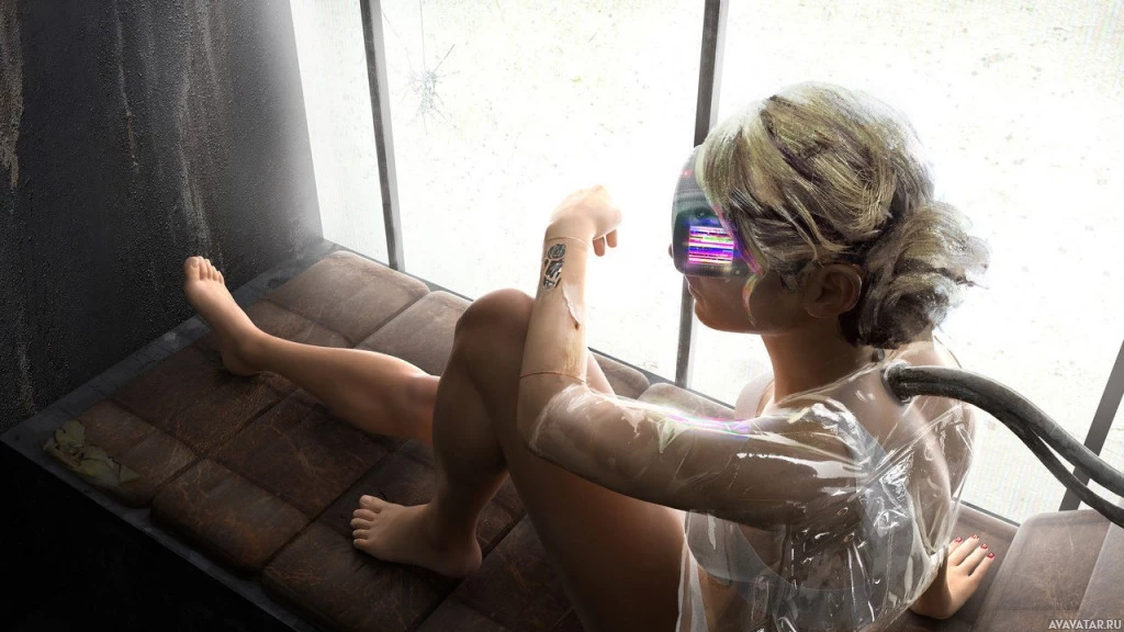 The image shows a woman sitting on a surface with her legs crossed. She is wearing what appears to be an augmented reality (AR) headset or glasses, which are often used for immersive