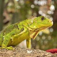 The image shows a lizard, specifically an iguana. It is resting on what appears to be the edge of a concrete structure or wall, possibly in a natural outdoor setting with some vegetation around.