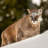 The image shows a mountain lion (also known as puma) sitting on snow-