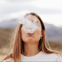 mouth area, indicating she is using an electronic cigarette or similar device. The background suggests a mountainous or desert-like environment with
