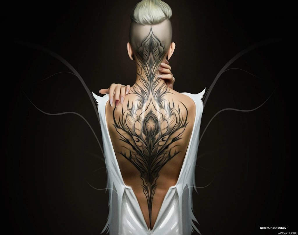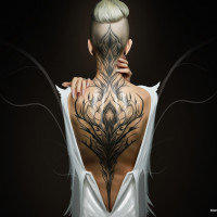 intricate tattoo that covers most of their back. The