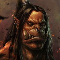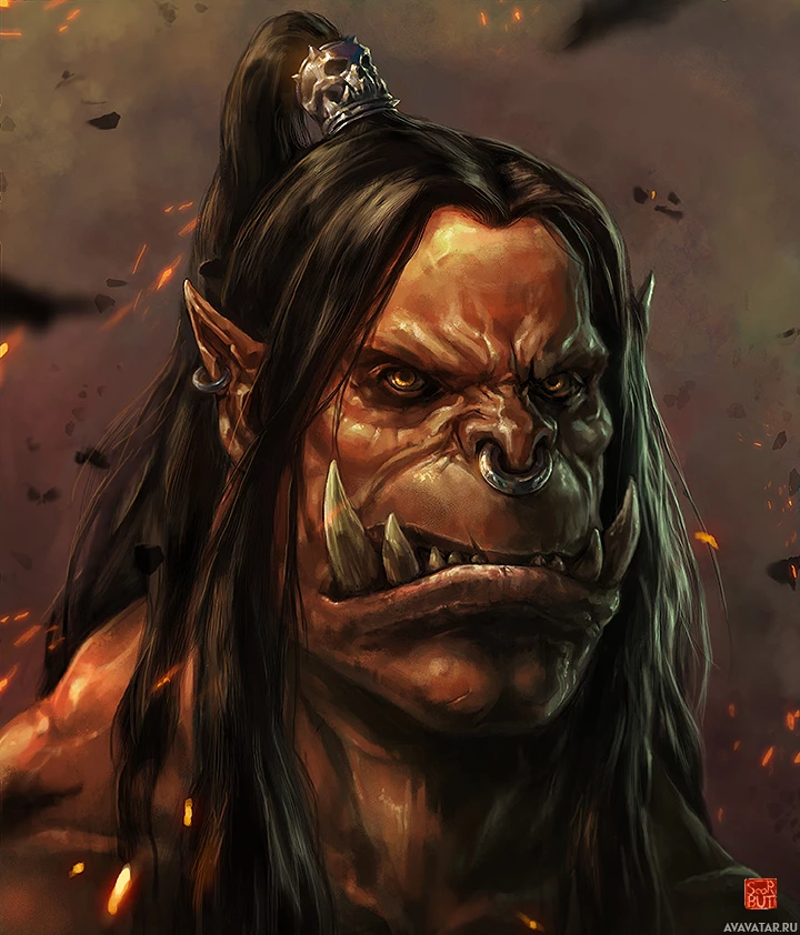 a menacing expression, and there are flames or fire effects around it, suggesting a sense of power or chaos. The orc has prominent features such as large ears,