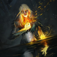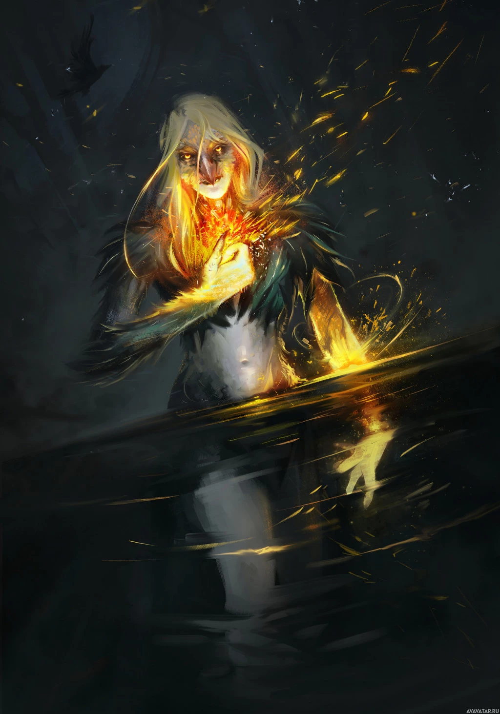 a dynamic pose, with magical energy and sparks emanating around her hand, which she holds out toward an open palm, suggesting that she might be casting or releasing magic. The setting appears to be dark and moody, fitting