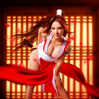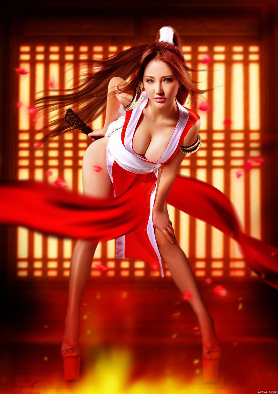 red hair and is wearing a traditional Japanese costume, possibly representing a ninja or warrior archetype given the sword she's holding. The background features what appears to be flames, suggesting a dramatic or intense setting, which may hint at her character being skilled in combat or fire-