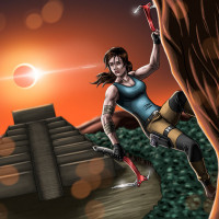 an animated character, Lara Croft, standing at the top of a staircase that leads to a pyramid-like structure. She is holding what appears to be an artifact or treasure in her right hand. The setting suggests an adventurous archaeological exploration, possibly inspired by scenes from the "Tomb Raider"