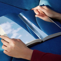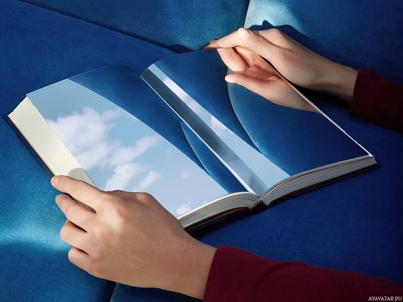 На картинке изображена рука человека, держащая открытую книгу с изображением неба или облаков на страницах, что позволяет предположить, что это окно в другой мир или связь с природой. Фон выполнен в нежно-голубом градиенте, который дополняет тематику книги.