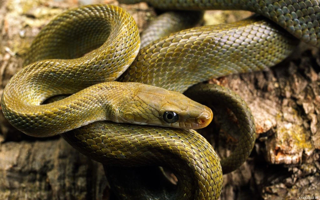 a non-venomous species, possibly a rat or king snake, based on its pattern and size, though it's not possible to provide a definitive identification without more context. The snake is coiled up with its scales visible, and it is resting or hiding among what looks like