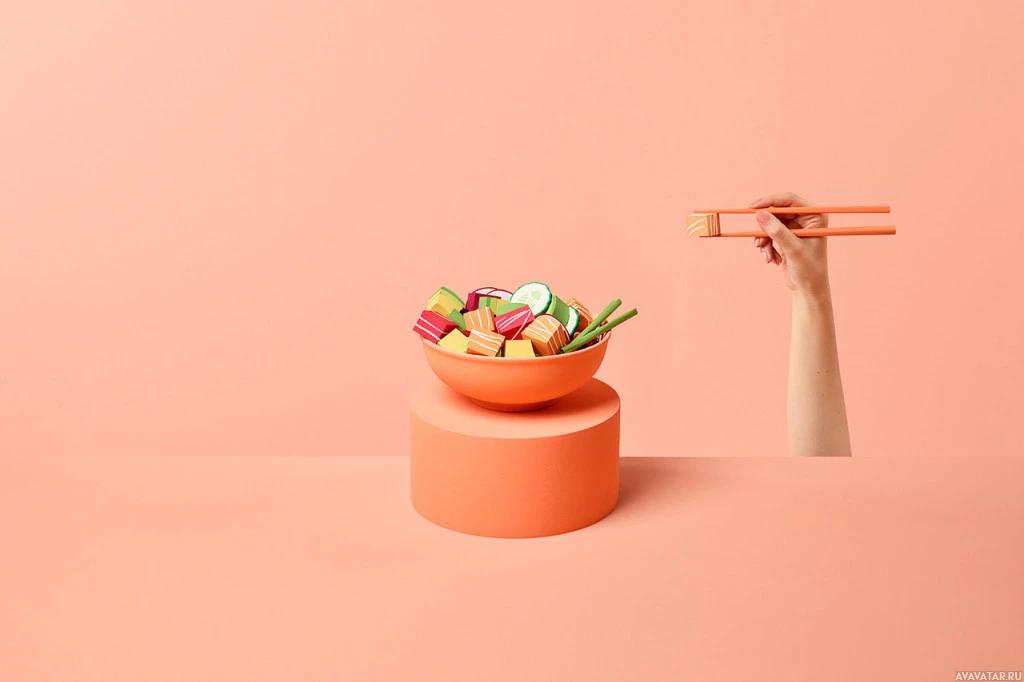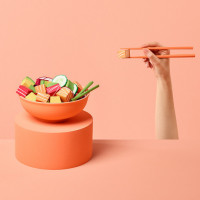 food items being held by someone who appears to be in the process of preparing or serving the food. There is another similar bowl on a stand beside them, suggesting that this might be part of a presentation or display of healthy food choices. The person's hand and arm are visible as they hold the bowl over the other one. The background has a solid color, providing a clear contrast to