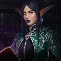 pointed ears, which are commonly associated with elves in various fantasy settings. She has a detailed and ornate outfit, featuring