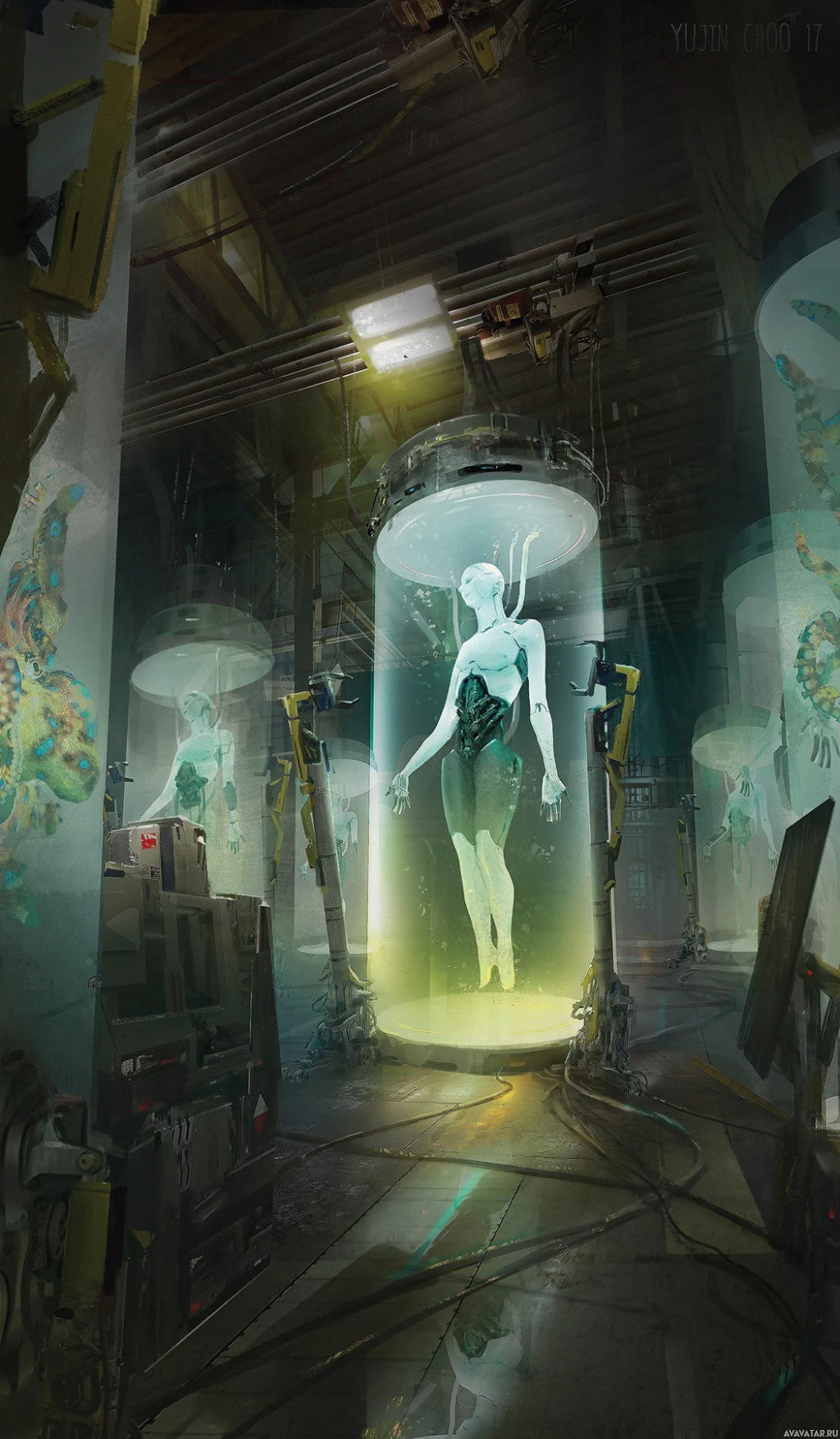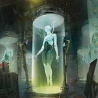 a humanoid figure encased in some kind of glass or transparent material. The figure has a human-like form but also exhibits mechanical or cybernetic enhancements. The background is dimly lit with a dark ambiance that suggests a sense of mystery and