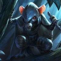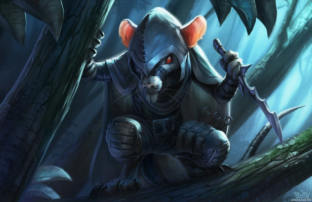 a fantasy creature resembling a rat, wearing what appears to be a hood and holding two swords crossed in front of it. It's sitting on a branch or fallen log, with the background suggesting